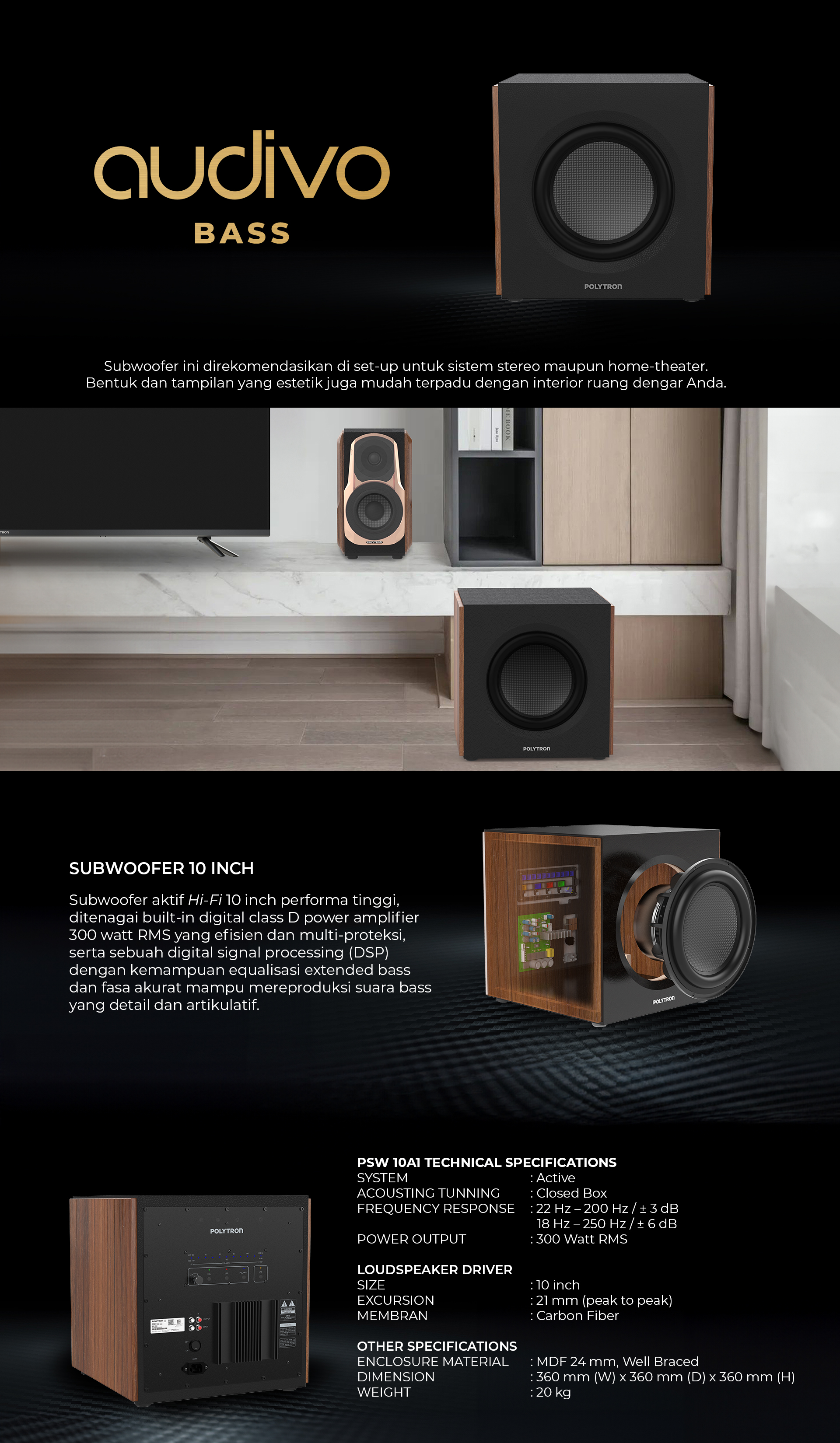 Subwoofer aktif Hi-Fi 10 inch performa tinggi, ditenagai built-in digital class D power amplifier 300 watt RMS yang efisien dan multi-proteksi, serta sebuah digital signal processing (DSP) dengan kemampuan equalisasi extended bass dan fasa akurat mampu mereproduksi suara bass yang detail dan artikulatif. Subwoofer ini direkomendasikan di set-up untuk sistem stereo maupun home-theater. bentuk dan tampilan yg estetik juga mudah terpadu dengan interior ruang dengar Anda.