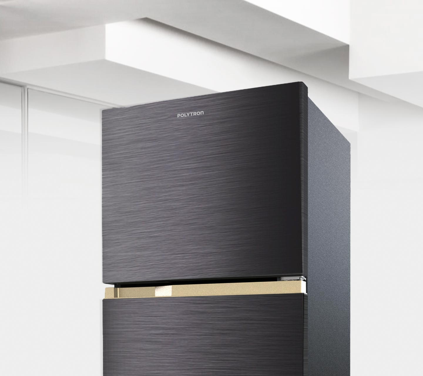 Kulkas 2 Pintu Metallic Series dari Polytron dengan teknologi pendinginan kompartemen freezer secara menyeluruh dari empat sisi sehingga pembuatan es menjadi 35% lebih cepat