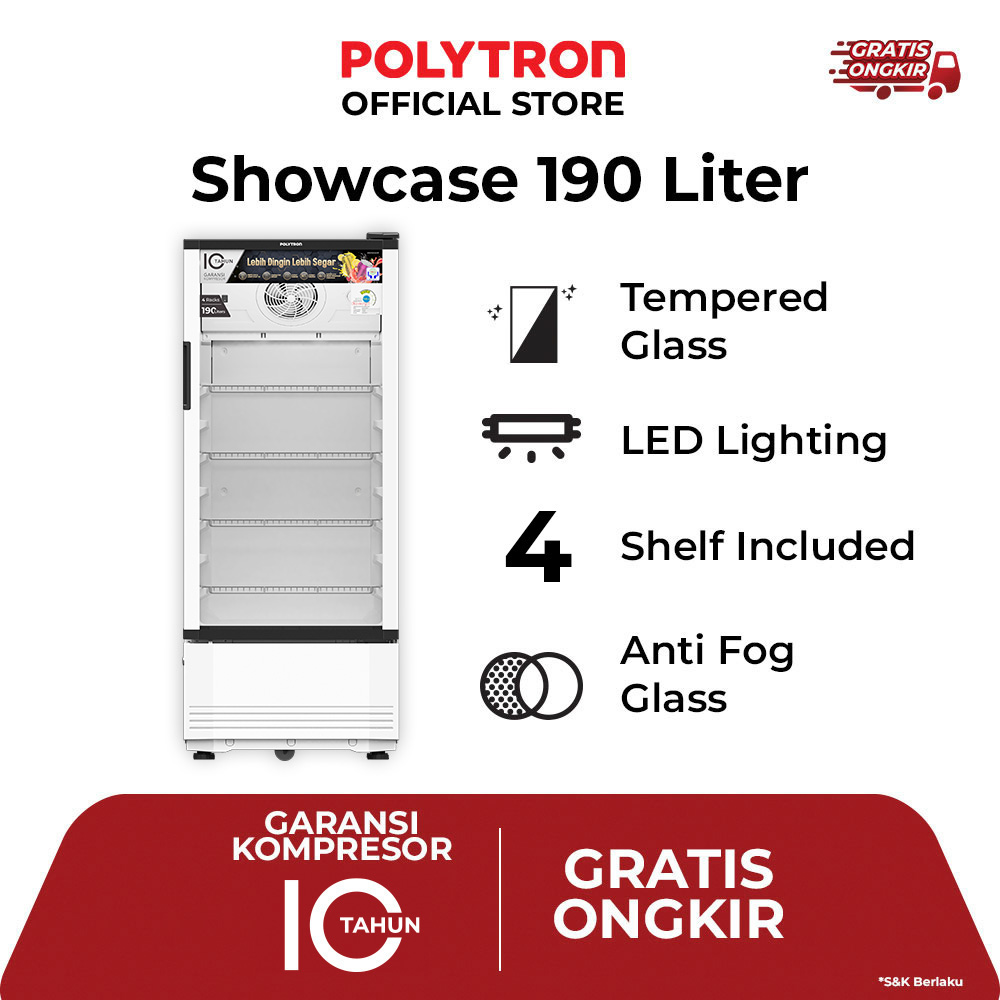 “POLYTRON Showcase 190 Liter SCN 190 adalah showcase dengan 4 rak dan pintu kaca sehingga memudahkan Anda melihat isi dalam showcase. Memiliki daya 190 W dan kapasitas hingga 190 L serta dilengkapi dengan fitur-fitur menarik, seperti LED Lighting, Anti Fogging Glass Door, Energy Saving, dan Adjustable Rack untuk kemudahan menyusun minuman. Dengan garansi 10 tahun*, SCN 190 jadi pilihan tepat untuk mendukung bisnismu.
