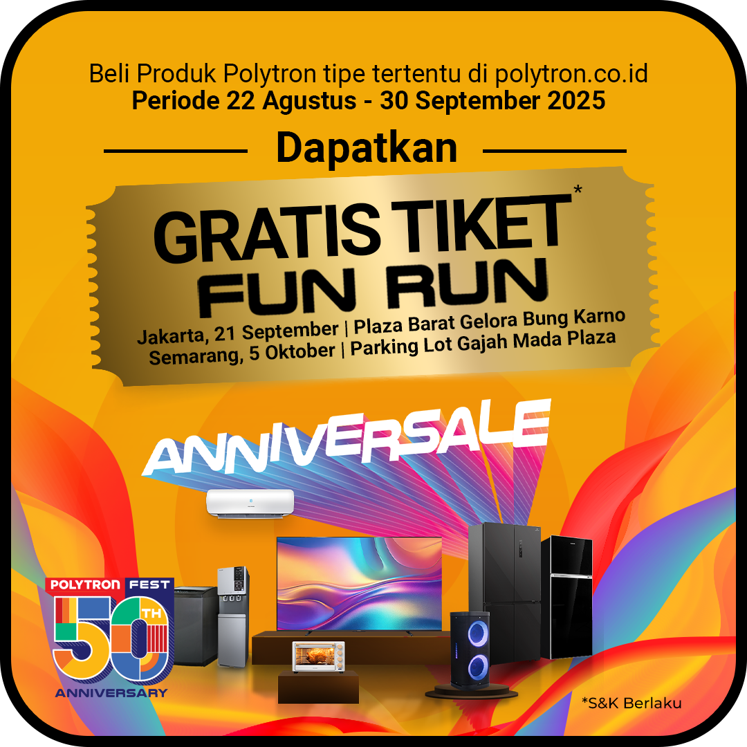 Pendaftaran Fun Run Polytron akan dibuka pada tanggal 22 Agustus 2025 pukul 19.00 WIB dan ditutup pada 16 September 2025 pukul 23.59 WIB.